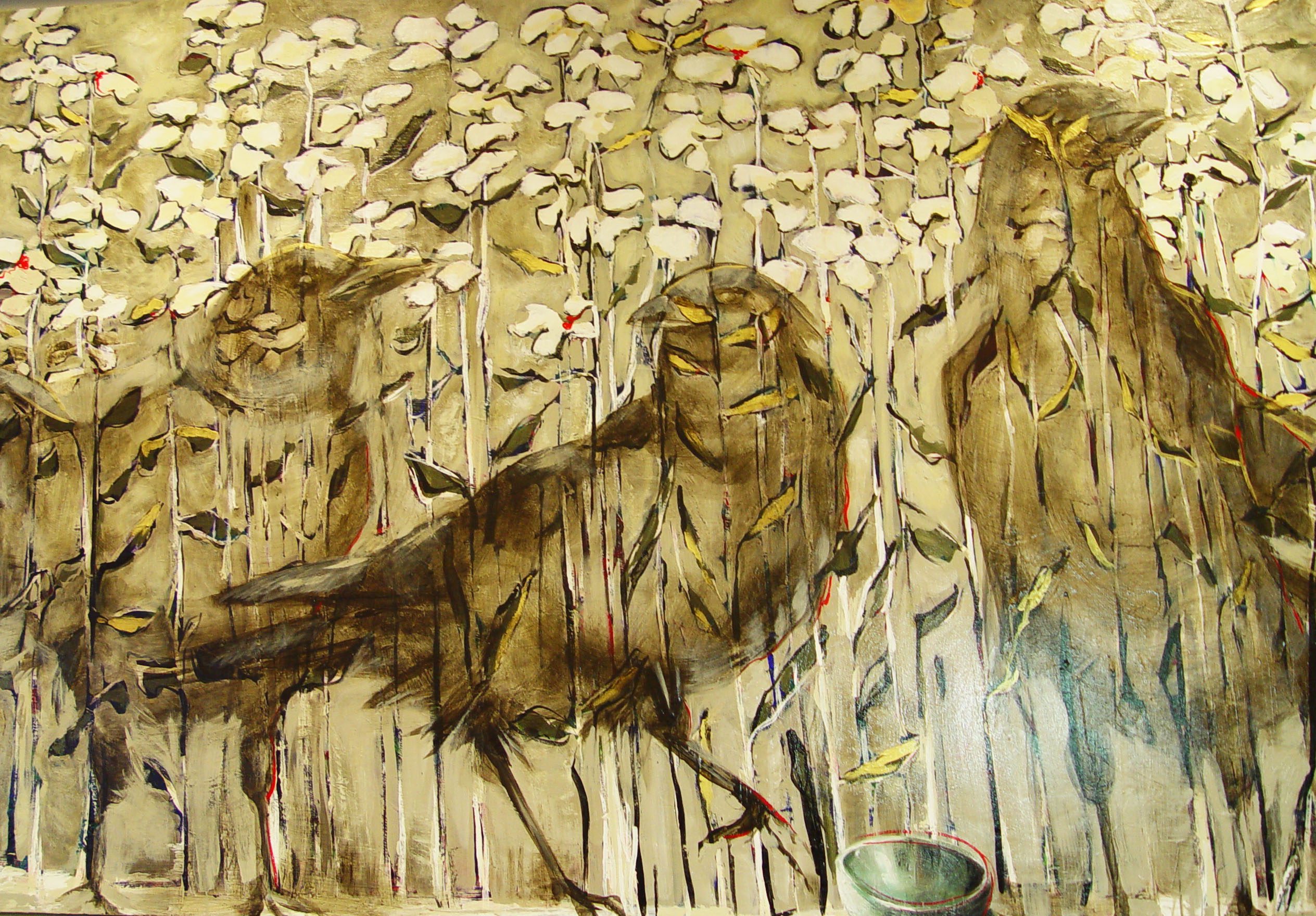 3 Crows and an Empty Bowl, acrylic on canvas, 5feet by 6feet